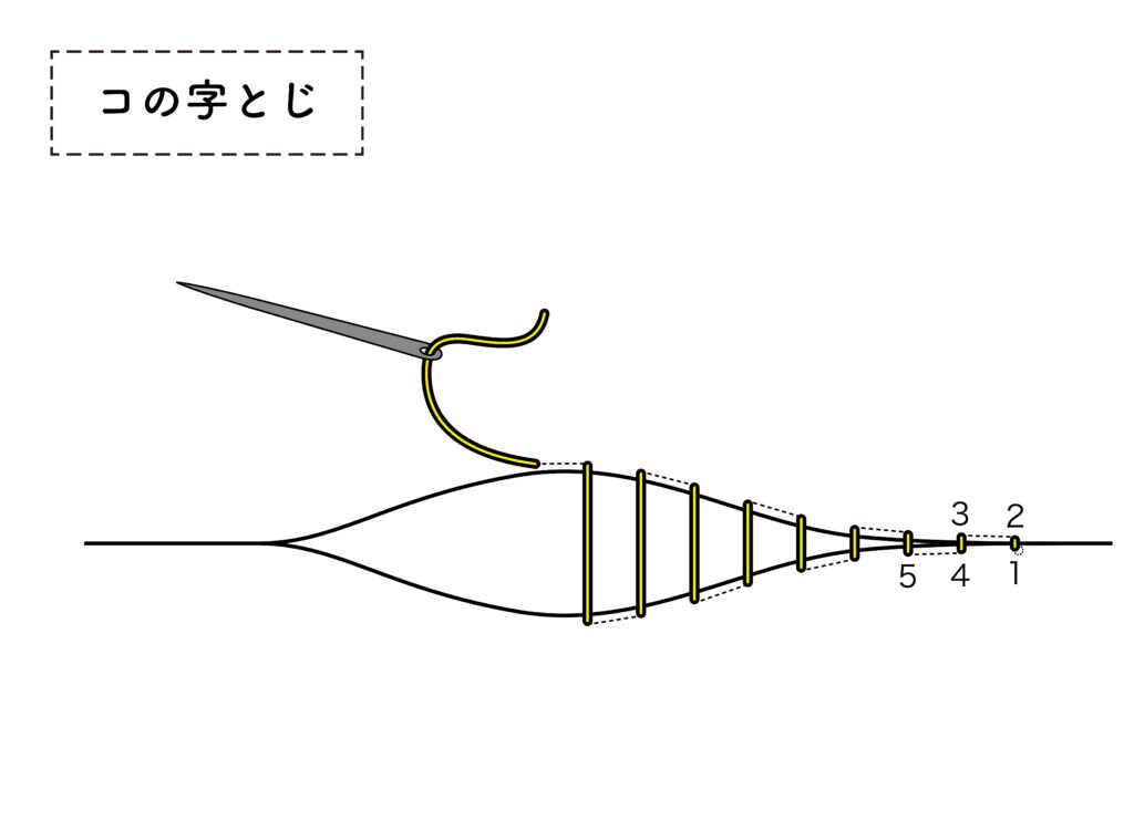 ②〜③を繰り返し、糸をひけば、コの字縫いのできあがり。
