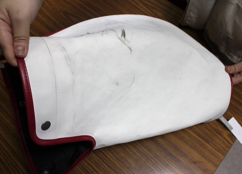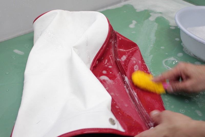 作業中の様子です。素材を傷めないよう、職人が手洗いで丁寧に汚れを落としていきます。全体的に白さが戻っていることがわかります。