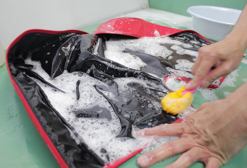 ゴルフバッグのような複合素材が使われている製品は、機械に任せるのではなく、職人による手洗いで丁寧に汚れを落とします。