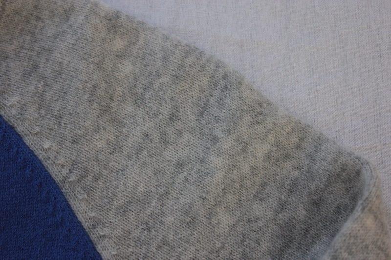 糸が一部引っ張られたことで、編み目の流れが乱れ、筋状のツレが出ている状態です。これもよくあるトラブルではないでしょうか。