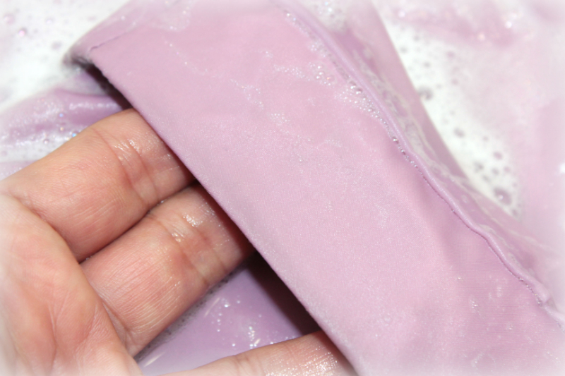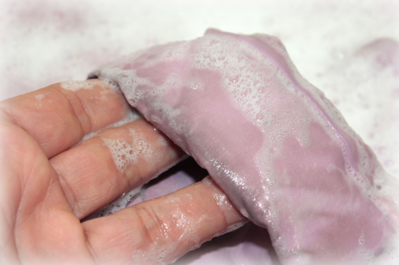 写真は、洋服に負担なく黄ばみ汚れを浮かすためにつけ置き洗いをしている様子です。