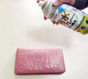 ③ 表面の汚れと水濡れを防ぐために、防水スプレーを、30センチ以上離したところから、ムラにならないように全体的に吹きかけます。シミにならないようにサッと吹きかけましょう。その後30分前後乾かしたら、さらに乾拭きやブラッシングをすると美しく仕上がります。